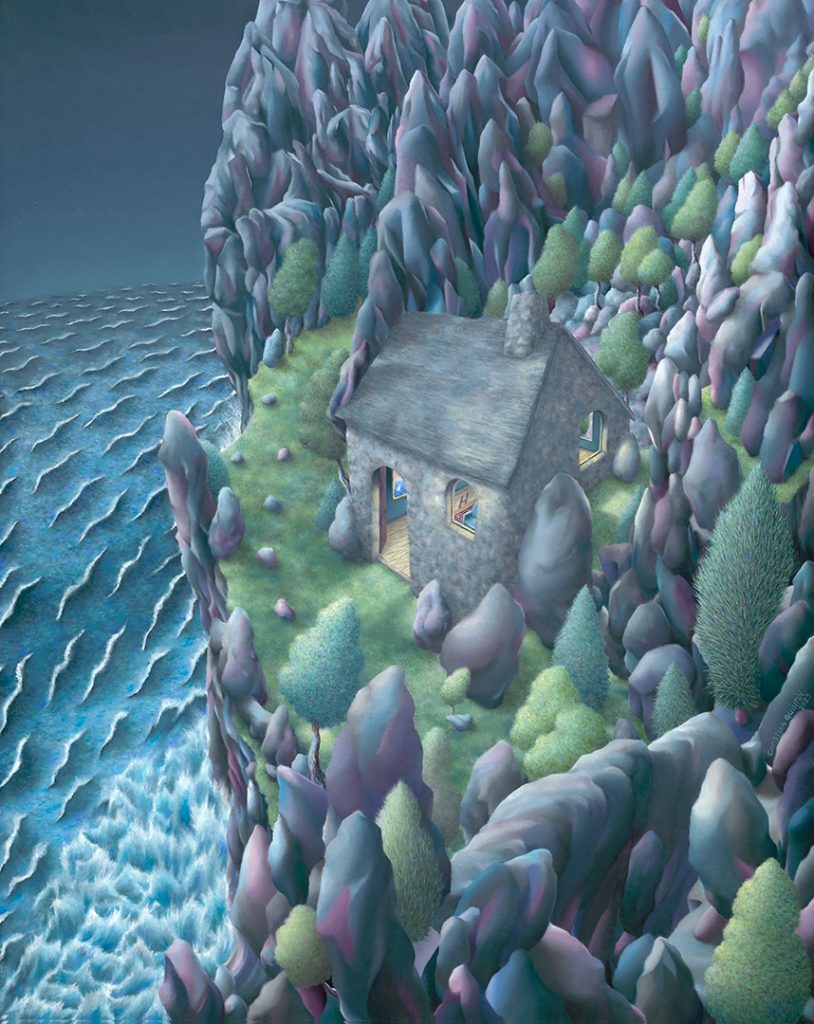 Quintin’s art begins with a coastline. He was born in 1957 in Saint Brieuc, a port town on the moody northern coast of Brittany. There, amid ruined castles and storm-lashed cliffs, he developed an early sensitivity to nature’s grandeur and melancholy. One island in particular—L’Île de la Comtesse—became a mythic point of return in his later works. Its architecture, its solitude, its storybook aura still appear like recurring dreams.