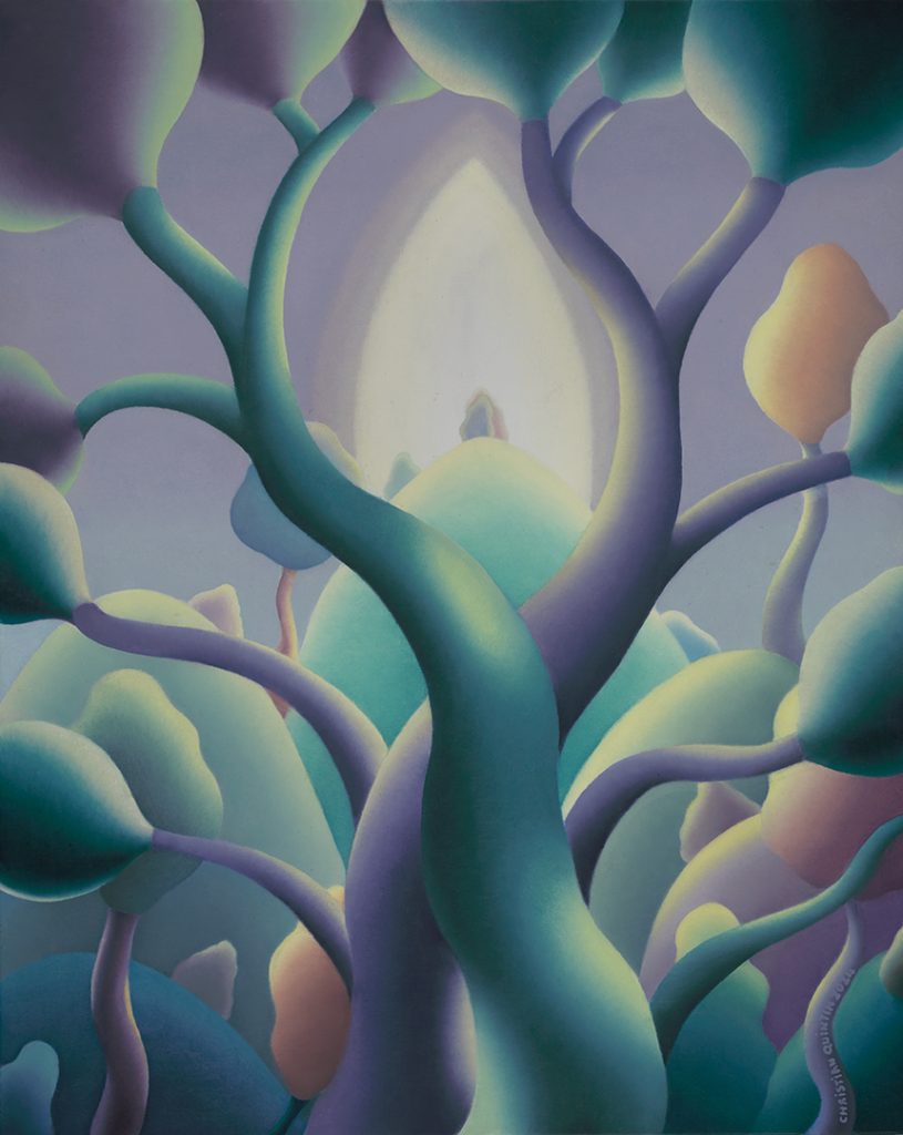 In his self-described “kaleidoscopic consciousness” paintings, boundaries dissolve. In The Aviary, Quintin’s face emerges from within a crystal, his neck becomes the trunk of a tree, and his hair unfurls as leafy canopy. It took him six months to complete—and the result is less a portrait than an ecosystem of self.